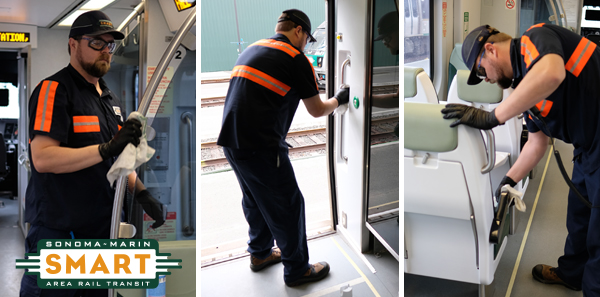 Twice a day (at mid-day and at night) we are thoroughly cleaning and wiping down the trains with a disinfectant.