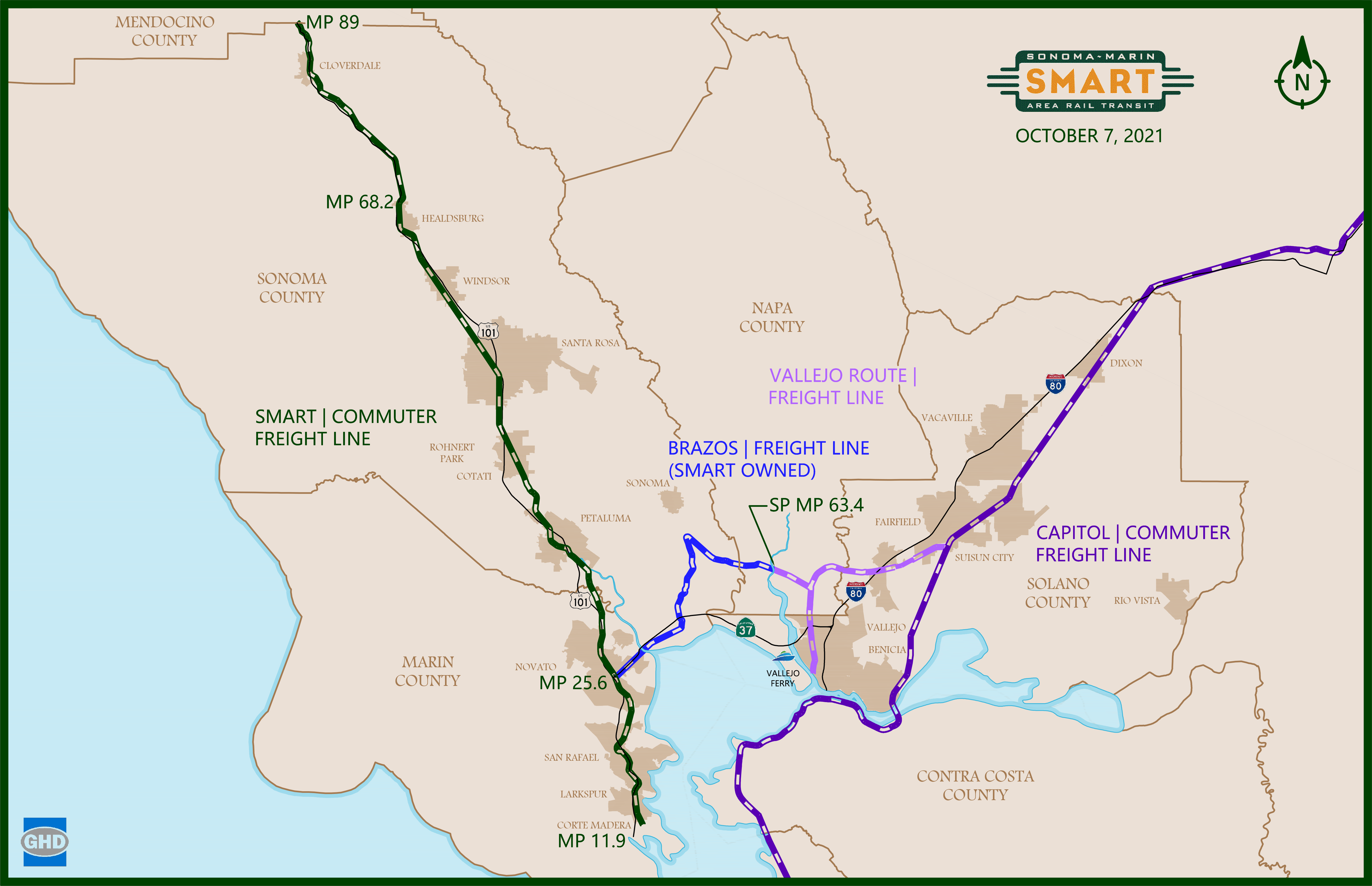 SMART now provides freight service to North Bay businesses. SMART Freight operates on the historic rail corridor constructed by Southern Pacific Railroad in the late 1800s and later utilized by Northwestern Pacific Railroad (NWP) beginning in 1914. Today, as a part of the legislative actions taken by Senator Mike McGuire to establish the Great Redwood Trail between Willits and Eureka California, SMART has taken over ownership of the rail corridor from Healdsburg to the Sonoma-Mendocino County line from the North Coast Railroad Authority, and now has the responsibility for providing freight service to North Bay shipping customers.